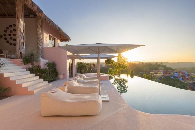 “We play very much with the windows and framing the views of Careyes—when the windows are open they look like a painting,” says Brignone. “There is always an element of water in every home, and the rooftops are done in the palapa style. We try to keep the rooms minimalist because you are already exposed to the beautiful colors of life—the sun, the ocean, the sky. When you go to your room, you want to find a sense of peace.”Â