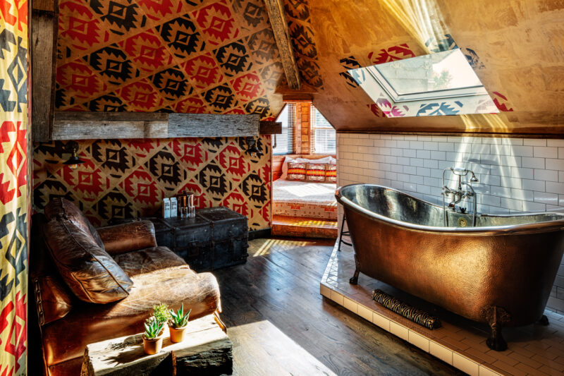 Around the same time the Dive Motel arrived, The Russell opened its doors elsewhere in East Nashville in a former 1904 church that was damaged by a tornado nearly a century later. The owners reclaimed what they could from the original structure—like the bell tower, pews, and iconic stained-glass windows—using them to drive the interior design, with maximum color and minimalist furnishings to make the architectural details the true stars of the show.